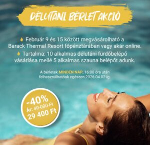 Kivételes ajánlattal várja vendégeit a Barack Thermal Resort: 2025. február 9. és 15. között elérhető a Délutáni Fürdőbérlet Akció, amely során a vendégek egy 10 alkalmas délutáni fürdőbérlet mellé ajándék 5 alkalmas szaunabelépőt kapnak.
